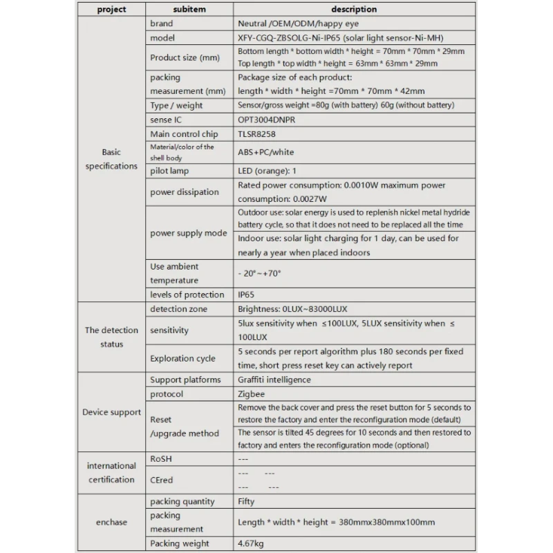 The MS25052201 ZigBee light sensor measures outdoor light intensity in real time and transmits the data to the Tuya platform. With high sensitivity (5 lux) and full ZigBee compatibility, it enables intelligent automation of lighting, curtains, and other connected devices. Compact and efficient, it is suitable for both residential and agricultural applications.