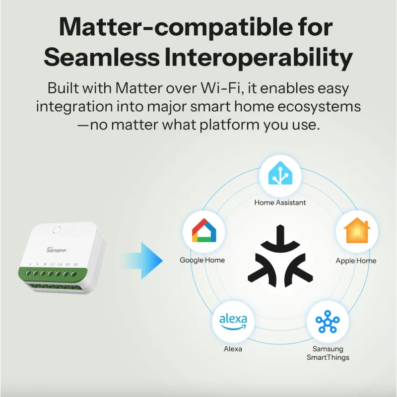 This compact Matter Wi-Fi dual relay module upgrades your existing electrical setup by enabling smart control of two independent circuits, while preserving the use of your traditional wall switches. With fast installation and compatibility with all Matter ecosystems, it brings modern functionality without rewiring.
