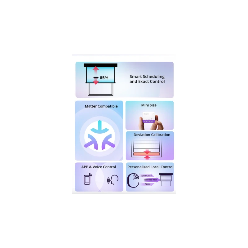 The SONOFF MINI-RBS is a compact and intelligent roller shutter switch designed for precise curtain and shutter automation. With seamless Matter integration, voice control, and smart scheduling, it fits perfectly into your home automation setup without requiring complex wiring.