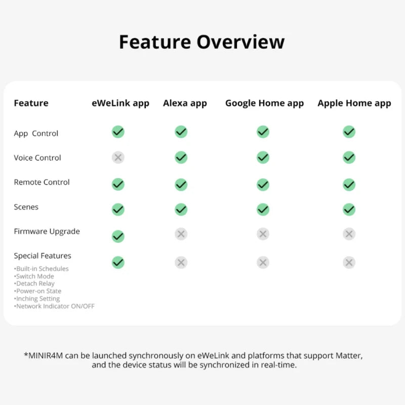 The SONOFF MINIR4M is SONOFF’s first Matter-certified smart switch, enabling seamless integration into major ecosystems like Apple Home, Google Home, Amazon Alexa, SmartThings, and more. Its compact form factor and versatile features make it ideal for turning standard switches or appliances into smart devices—without replacing existing setups.