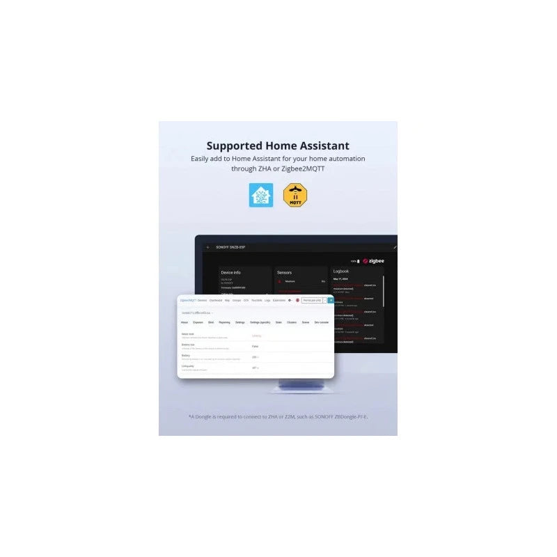 Compatible with Home Assistant through ZHA or Zigbee2MQTT (requires a ZigBee dongle such as SONOFF ZBDongle-P or ZBDongle-E).