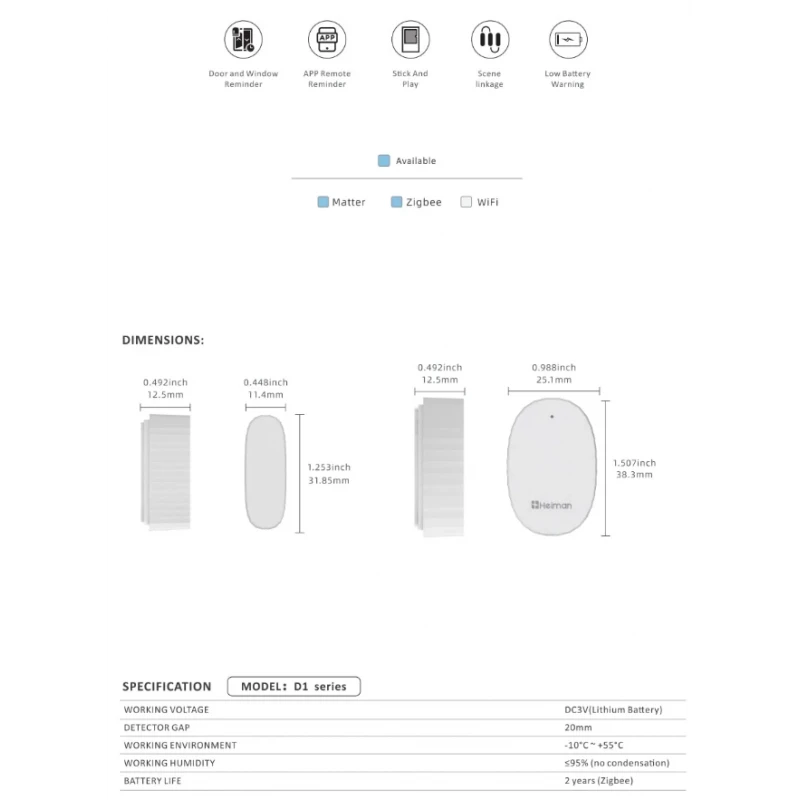 HEIMAN D1-M on kompakti ja moderni ovi- ja ikkuna-anturi, joka on suunniteltu reaaliaikaiseen kulunvalvontaan. Natiivin Matter over Thread -tuen ansiosta tämä anturi integroituu saumattomasti mihin tahansa älykotialustaan, kuten Apple Homeen, Google Homeen, Amazon Alexaan ja Home Assistantiin . Sen elegantti ja palkittu muotoilu varmistaa, että se sulautuu hienovaraisesti mihin tahansa sisustukseen ja tarjoaa samalla korkeatasoista suorituskykyä ja luotettavuutta.