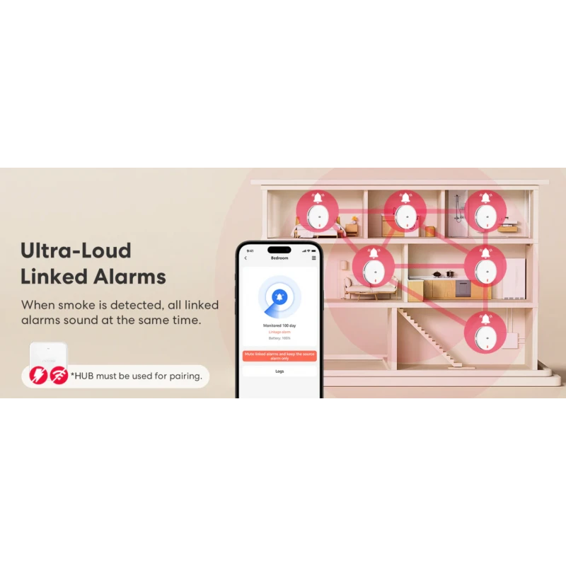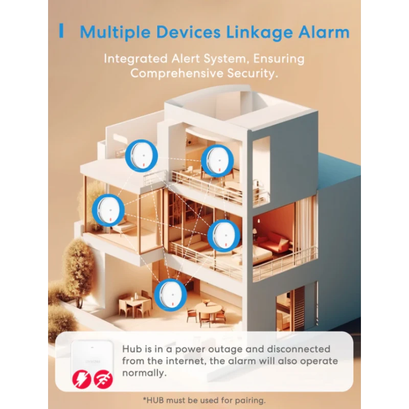 - Powerful Alarm: The detector emits ≥ 85 dB; the hub emits a 110 dB siren for synchronized alerts.