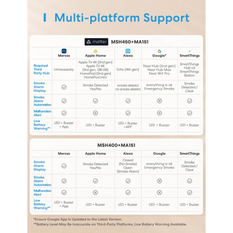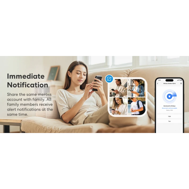 The Meross MA151 is a smart smoke detector offering advanced protection by combining smoke detection, intrusion monitoring, and tamper alerts. Paired with the Matter-enabled MSH450MA hub, it creates a complete home safety system with real-time notifications, multi-user access, and smart automation capabilities.