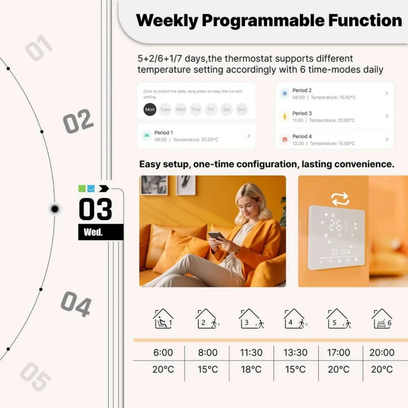 Its modern white design, touch screen interface, and flexible programming modes let you take control of your heating remotely and efficiently. With temperature precision and low energy consumption, it helps you save energy without sacrificing comfort.