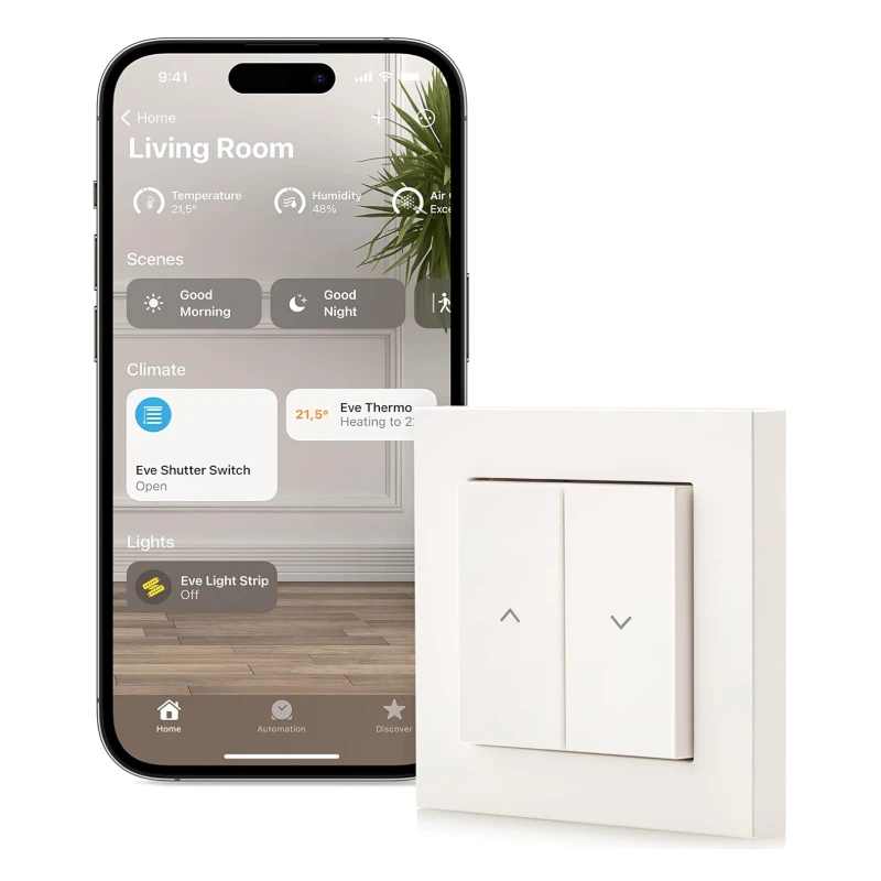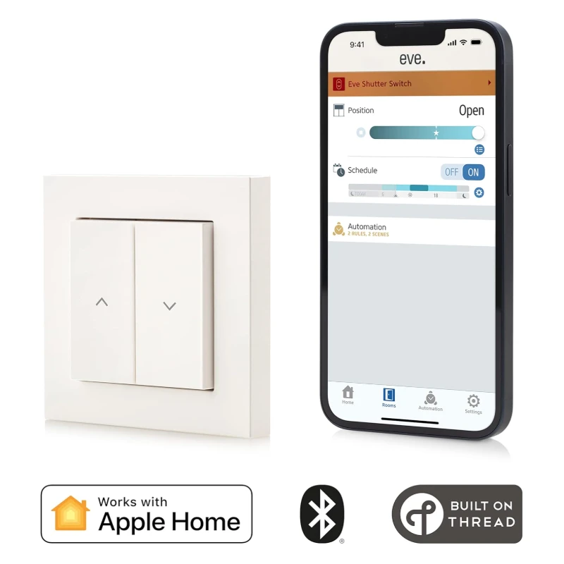 The Eve Shutter Switch offers a seamless, private way to automate and control your roller shutters. With Matter and Thread technology, it integrates effortlessly into your smart home setup—no cloud, no registration, just secure and responsive control via app or voice assistants like Apple HomeKit, Alexa, Google Home, and SmartThings. Set schedules, automate daily routines, and improve comfort and security in your home.