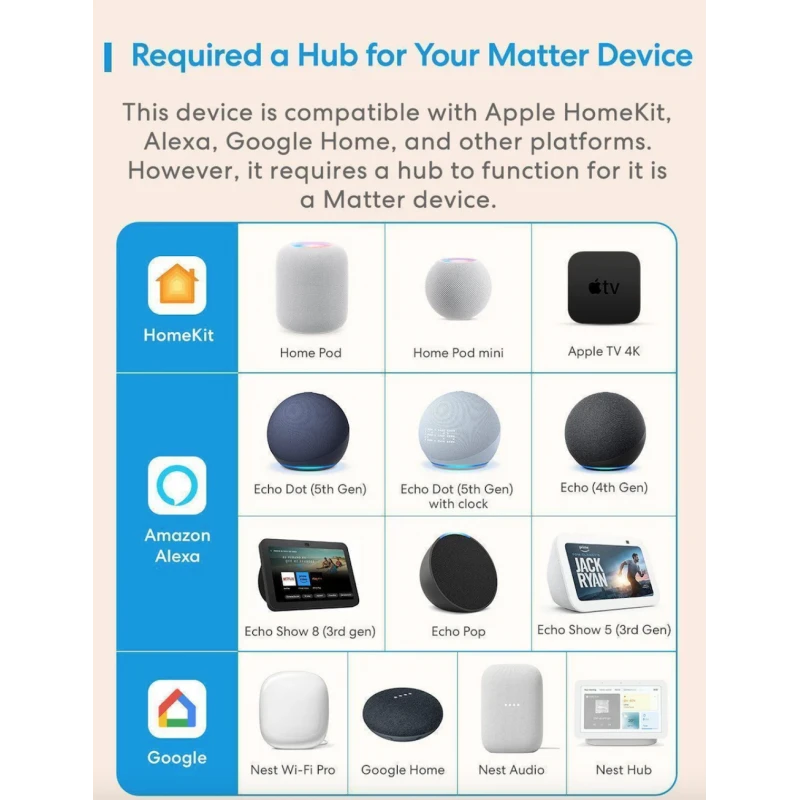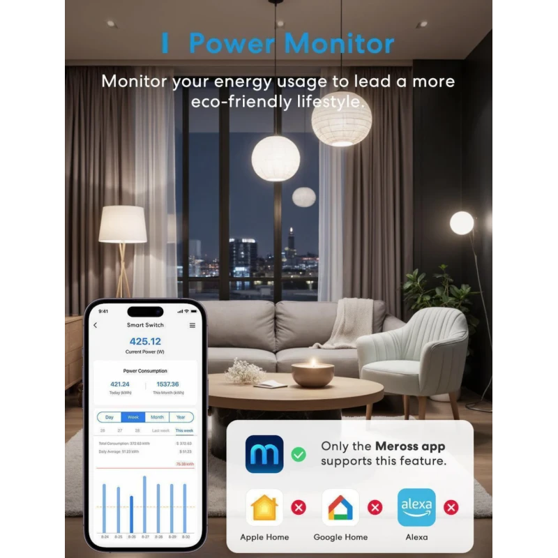 - Platforms: Apple HomeKit, Google Home, Amazon Alexa, Meross, Home Assistant