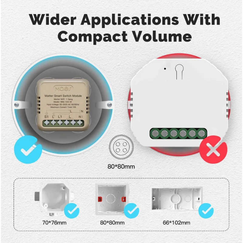 Upgrade your electrical system with the MWM-104-M-MS, a compact WiFi relay switch module fully compatible with the Matter protocol. Easily control lights or appliances via voice assistants or mobile apps without replacing your existing wall switch.