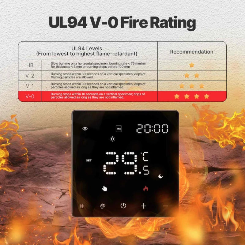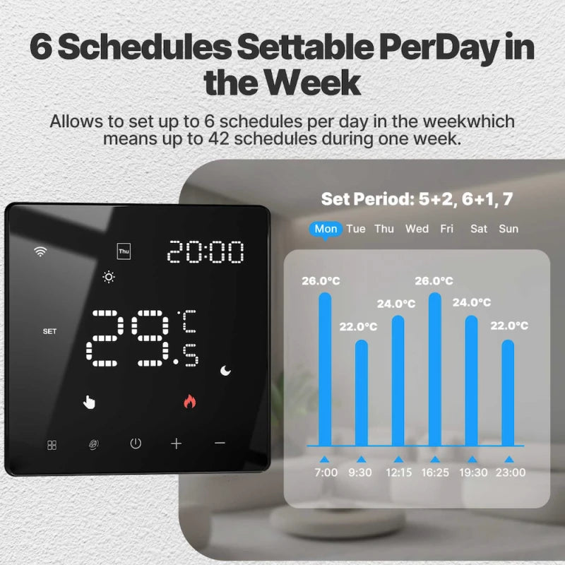 Control your heating system remotely using the MOES or Tuya Smart Life app. The thermostat is also compatible with Amazon Alexa and Google Home for hands-free voice control. Whether you’re home or away, you can manage your heating with ease and efficiency.