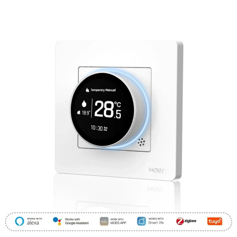 The MOES Zigbee-connected thermostat is designed to deliver precise and efficient control for hydraulic underfloor heating systems. Compatible with the Zigbee protocol, it allows seamless integration into your smart home, providing comfort, energy savings, and remote management via app or voice assistant.