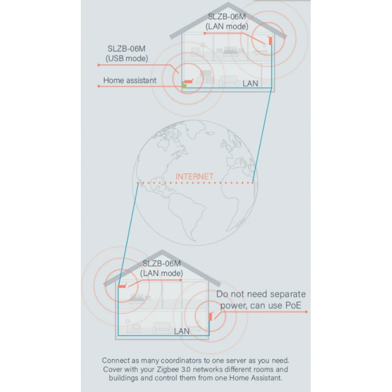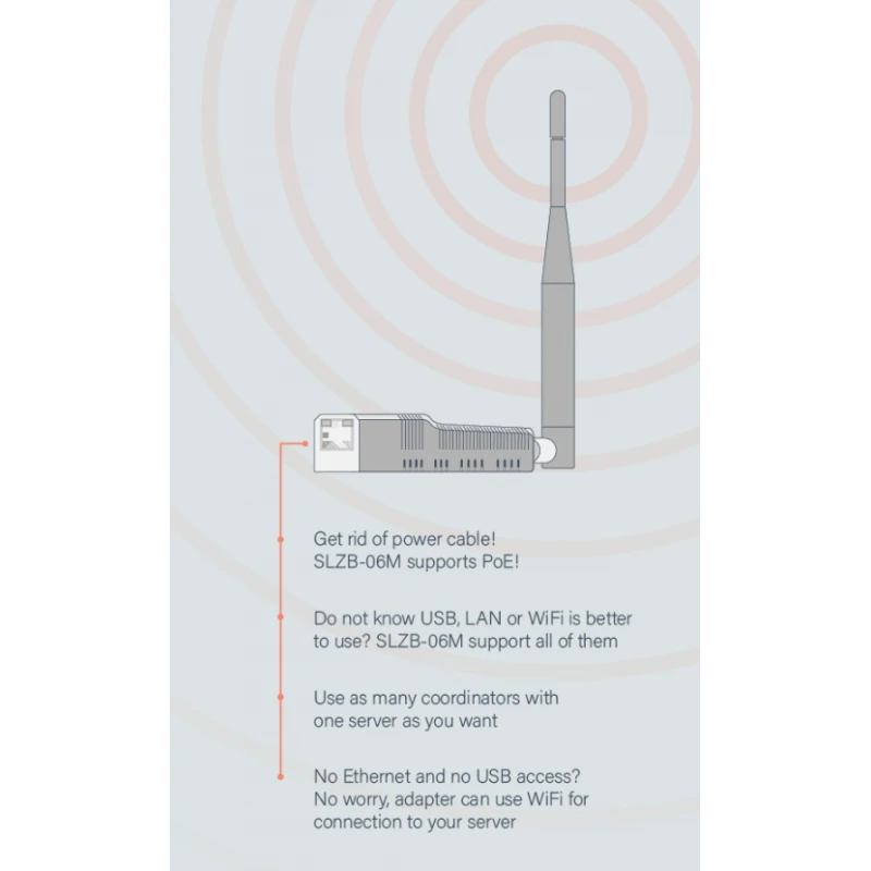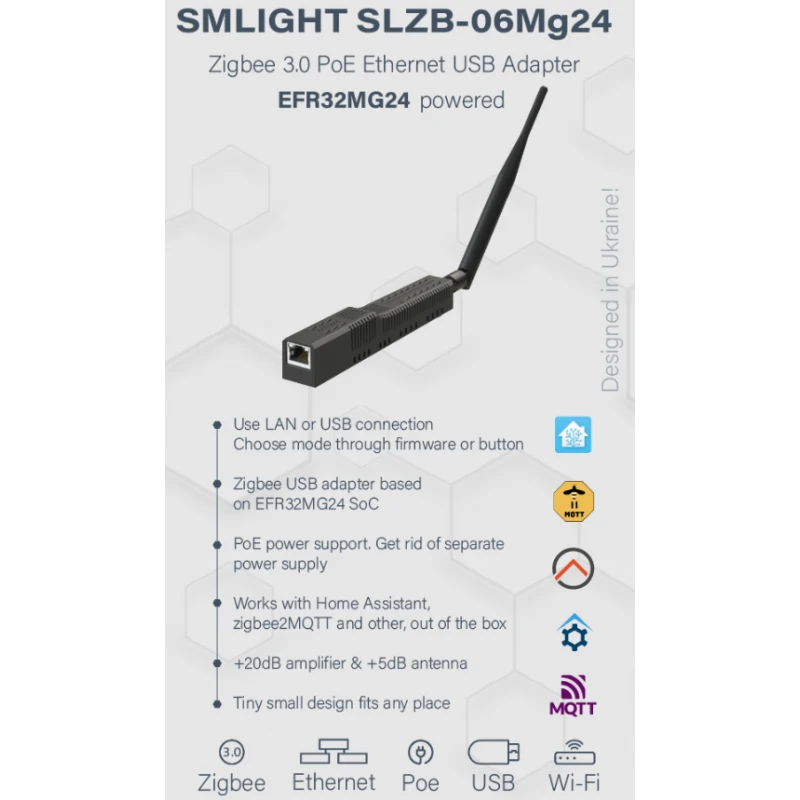 Thanks to its integrated +20 dB amplifier and external +5 dB rotatable antenna, the SLZB-06MG24 offers superior coverage, making it ideal for large or complex environments. It supports multiple operating modes—coordinator, router, or switchable via web interface—providing the adaptability needed for any smart home or commercial setup.