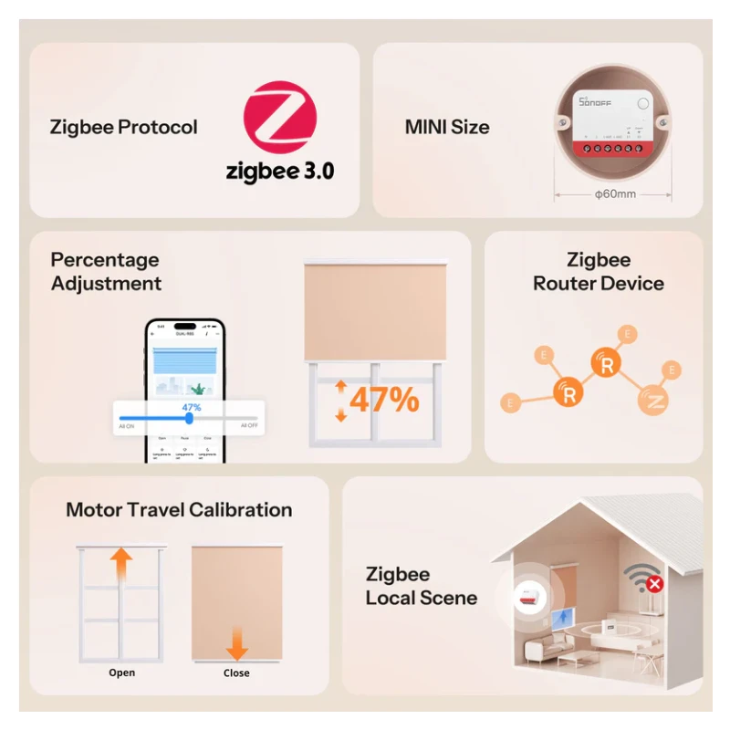 The SONOFF MINI-ZBRBS is an intelligent Zigbee 3.0 roller shutter module designed to transform your existing shutters, blinds, or curtains into smart, connected equipment. Thanks to its compact size, it fits easily into standard 60/80 mm European wall boxes and is ideal for modernizing your installations with precision and flexibility.