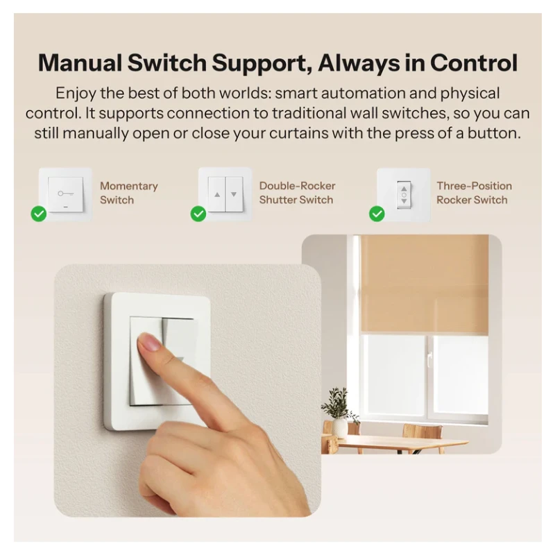 - Manual Switch Compatibility: Supports local control via existing wall switches.