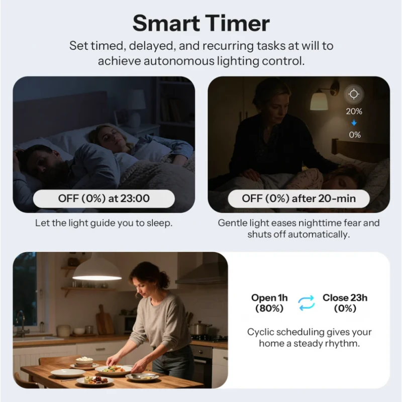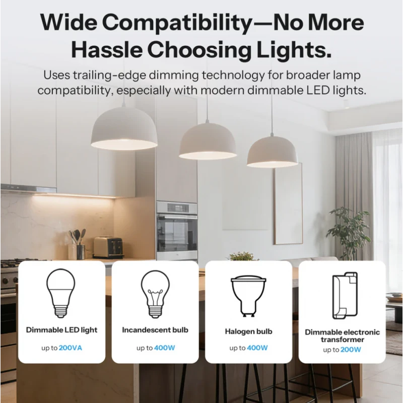 - Lighting Control: Supports dimmable LED lamps up to 200VA and halogen/incandescent up to 400W