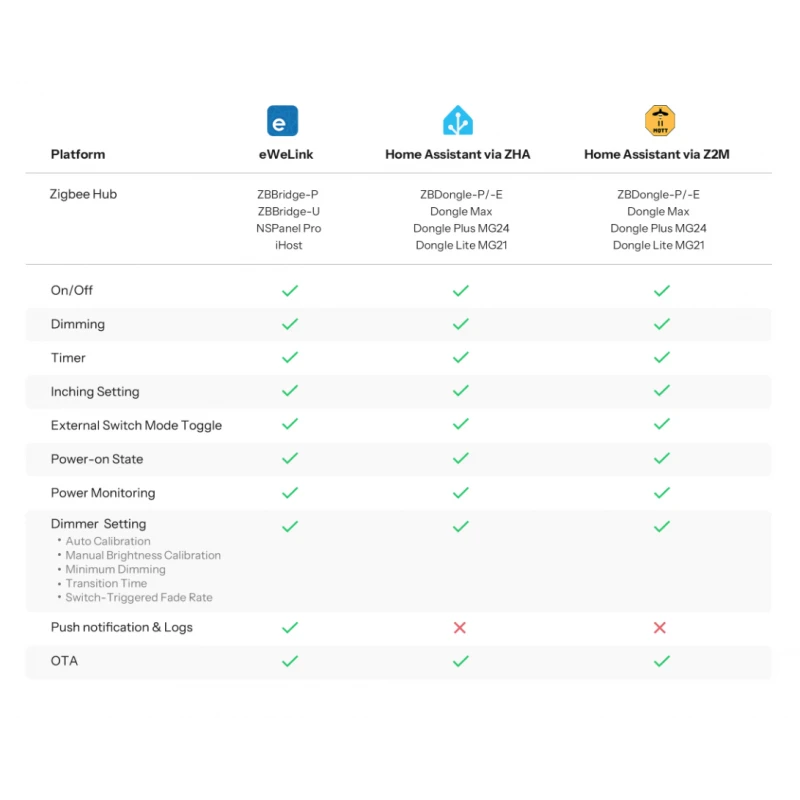 - Home Assistant: Supported via ZHA or Zigbee2MQTT