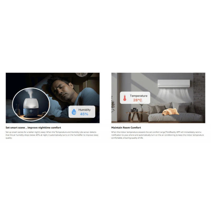 The THIRDREALITY Sensor Lite Zigbee temperature and humidity sensor delivers precise, real-time monitoring of your indoor environment. Designed for smart homes, it accurately tracks temperature and humidity levels to improve comfort, security, and automation. Equipped with a high-precision Sensirion sensor, it provides reliable data for managing systems such as heating, ventilation, and humidification. A compatible Zigbee hub is required for operation.