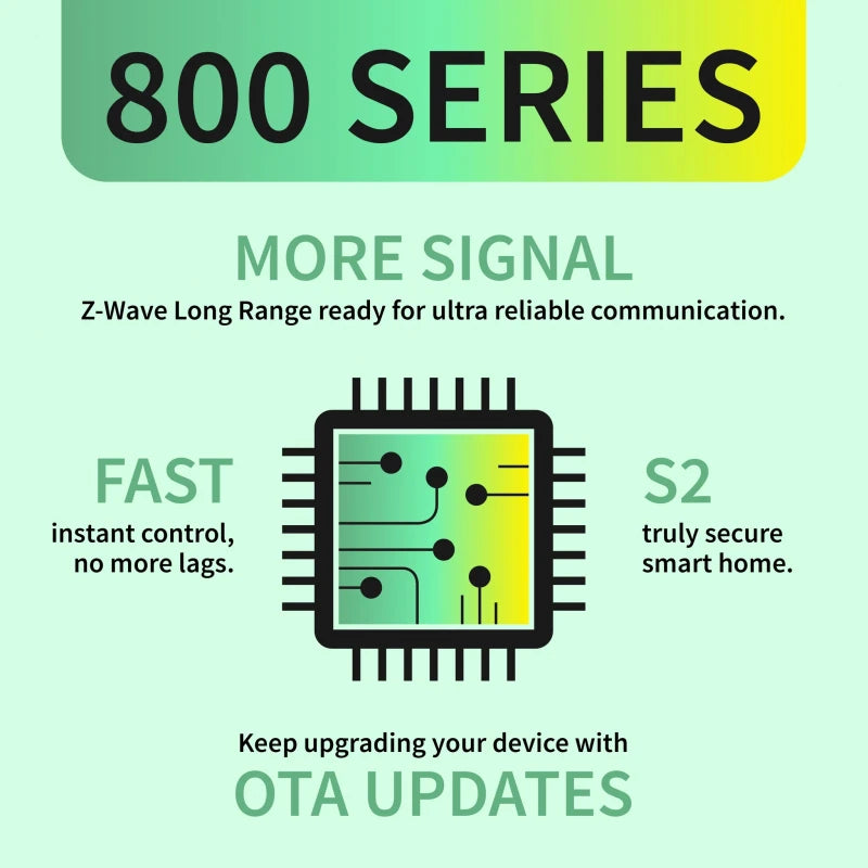 Featuring the latest Z-Wave 800 chip, the module ensures faster communication, improved range, and reliable operation. It supports S2 security and SmartStart for secure and easy integration.